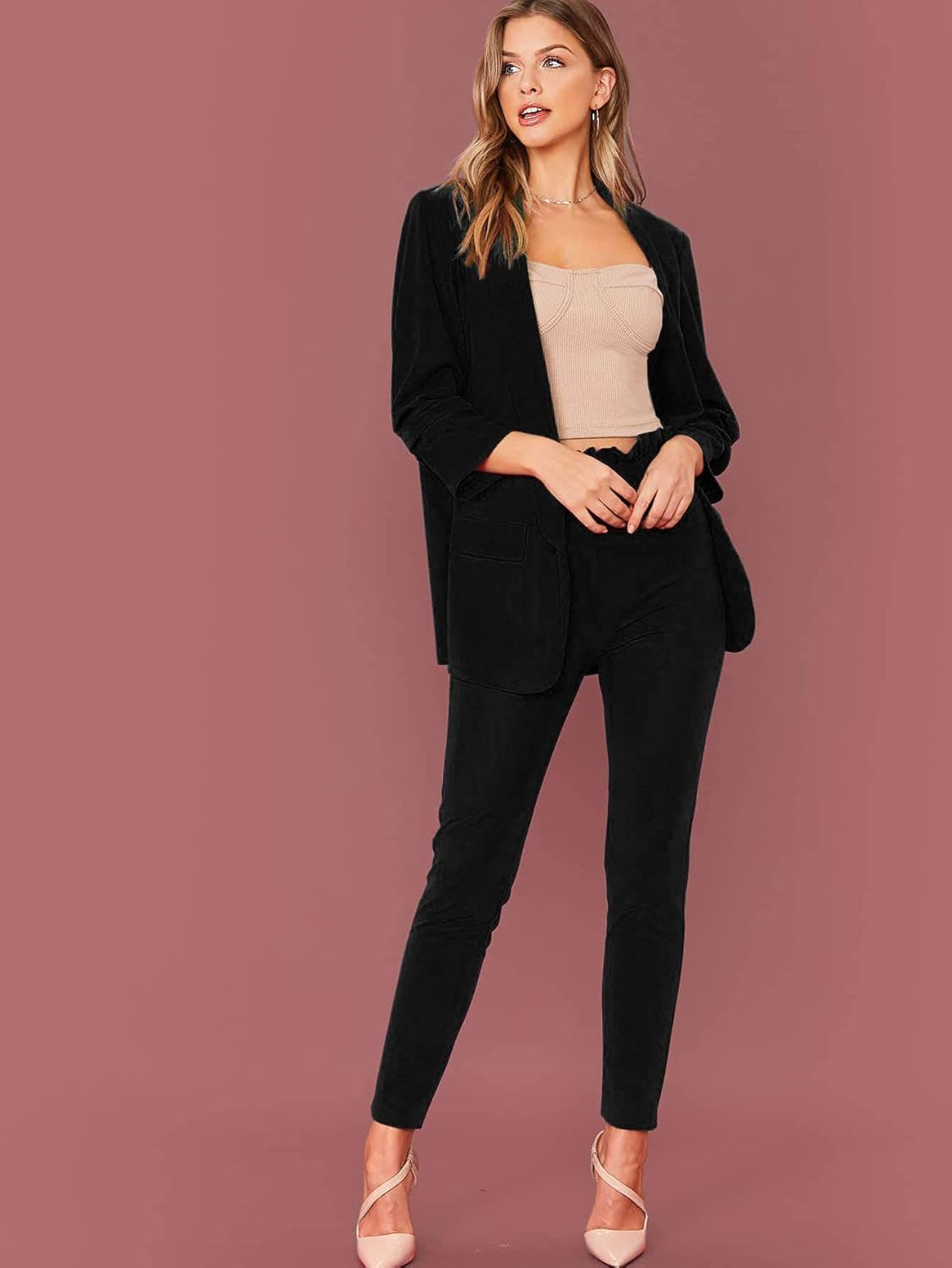 SheIn Women's Two Piece Open Front Long Sleeve Blazer and Elastic Waist Solid Pant Set Suit