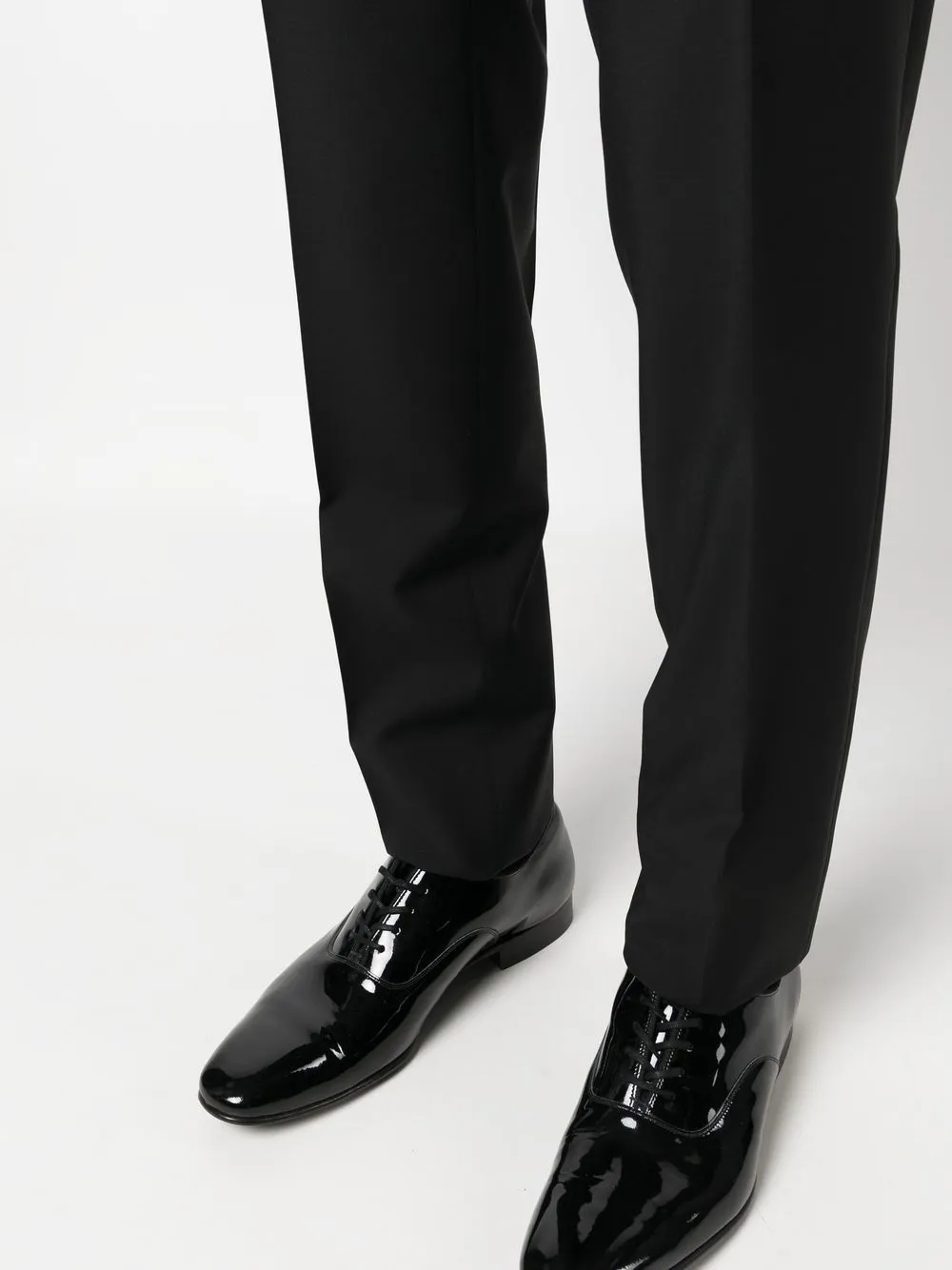 jet black wool-mohair blend Blazer: classic lapels front button fastening long sleeves chest welt pocket two front welt pockets Trousers: belt loops concealed front fastening two side inset pockets two rear welt pockets
