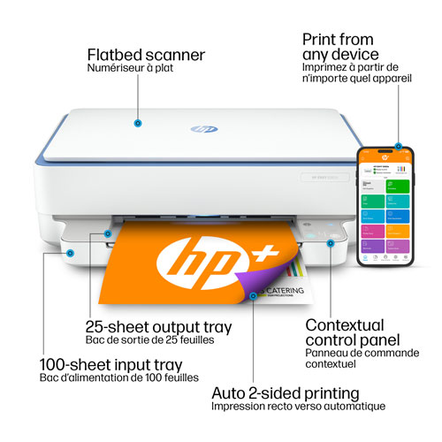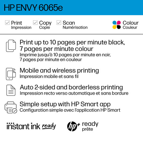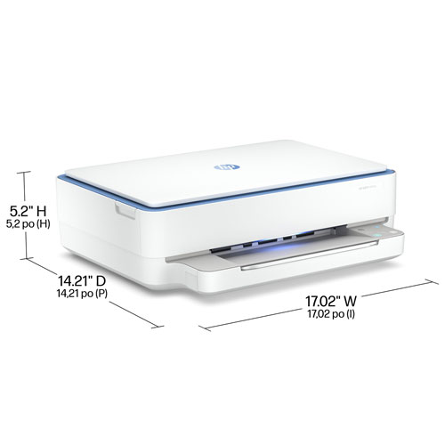 Print, scan, and copy at home with the HP Envy 6065e colour wireless printer. This all-in-one inkjet printer prints up to ten crisp black or seven vivid colour documents per minute, with scan and copy functions available for added versatility. It offers a USB port and Wi-Fi support to allow for easy connection to computers and mobile devices.