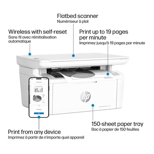 The HP Wireless All-In-One laser printer is your compact powerhouse for home offices and small businesses. Ideal for one to three users, this printer delivers crisp black-and-white prints, scans, and copies. With lightning-fast print speeds of up to 19 pages per minute, it enhances your productivity. Its self-resetting Wi-Fi keeps you always connected.