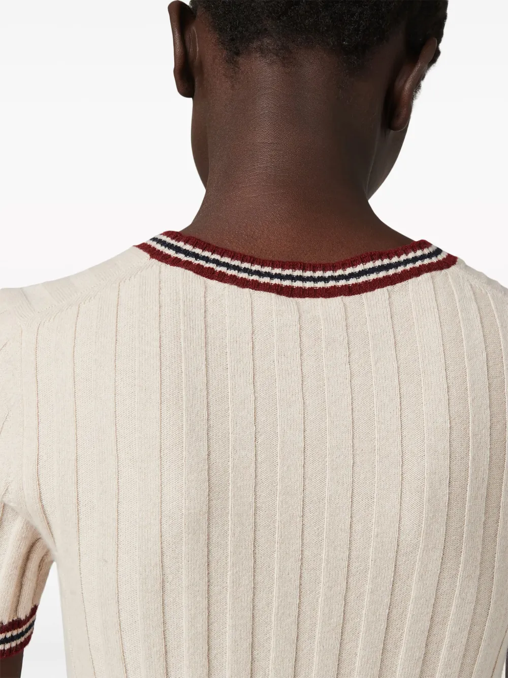 Miu Miulogo-appliqué cashmere topHighlightsbeige cashmere ribbed knit appliqué logo round neck short sleeves straight hem CompositionCashmere 100%Washing instructionsRead Manufacturer GuidelinesProduct IDsFARFETCH ID: 22583258Brand style ID: MML874SOOO138Q