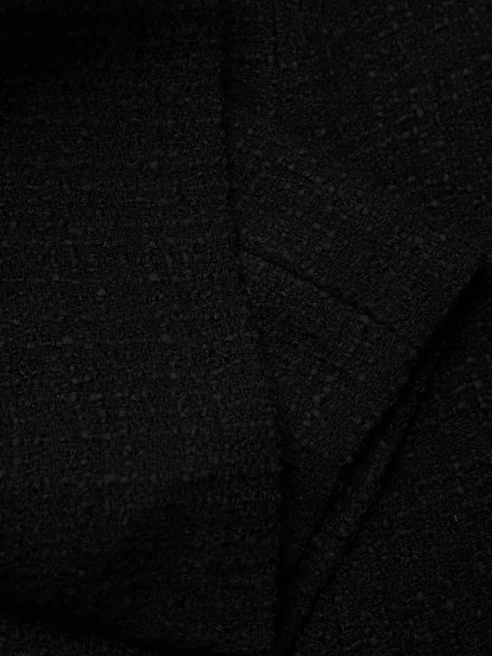 SANDROtailored wide-leg tweed trousersHighlightsblack cotton blend tweed tailored design high waist wide leg two front welt pockets side zip fastening CompositionOuter: Cotton 49%, Viscose 25%, Acrylic 20%, Polyamide 6%Lining: Polyester 100%, Cotton 90%Washing instructionsDry Clean OnlyWearingThe model is 1.78 m wearing size 36Product IDsFARFETCH ID: 20208362Brand style ID: SFPPA01255